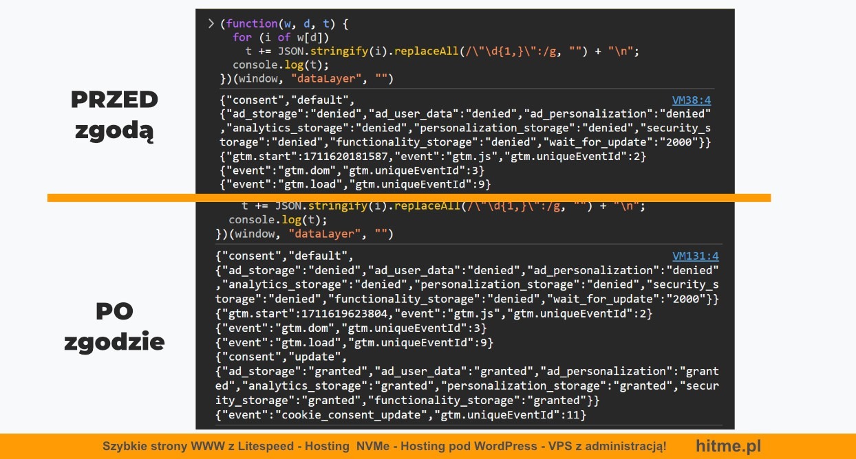 Poniżej znajdziesz skrypt, który można uruchomić w konsoli przeglądarki (najczęściej dostępna po naciśnięciu klawisza F12 w większości przeglądarek). Skrypt ten umożliwia weryfikację ustawień zgody zapisanych bezpośrednio w Menedżerze Tagów Google.
