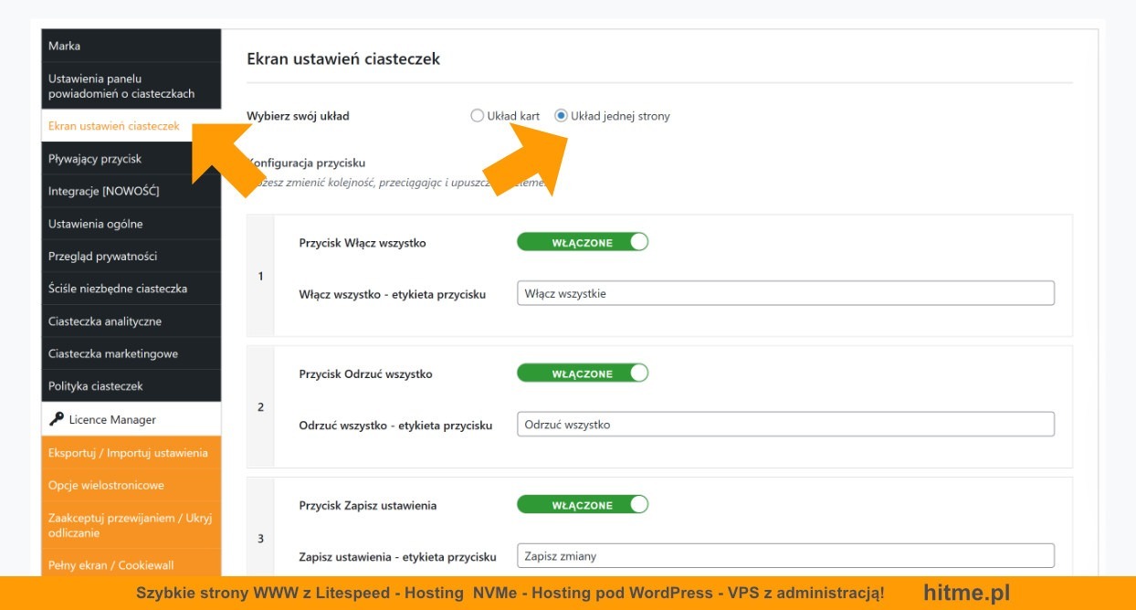 . Warto też ustawić ekran wyboru ciasteczek na „Układ jednej strony” oraz aktywować pływający przycisk, gdzie odwiedzający może zawsze zmienić swoje ustawienia.
